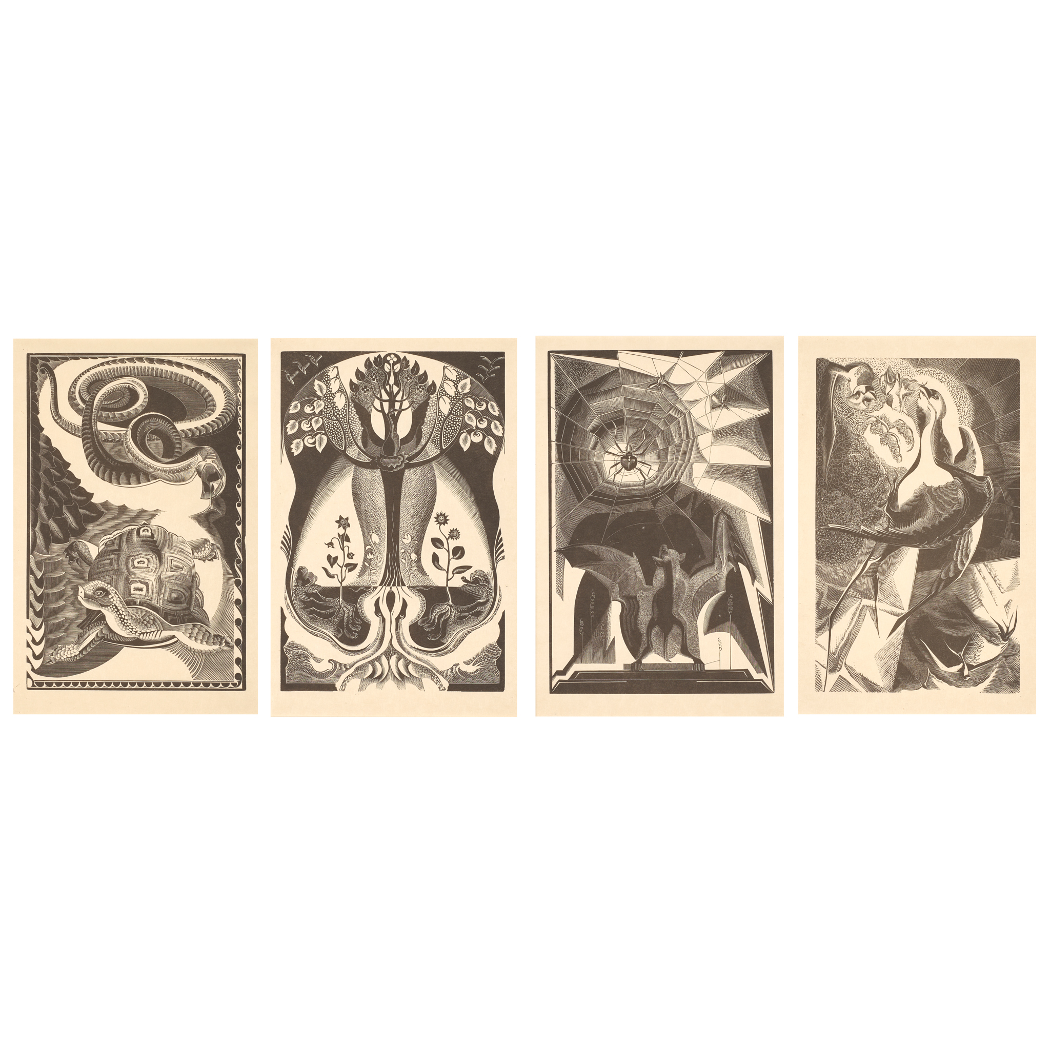 FOUR WOOD ENGRAVINGS FOR 'THE NATURAL HISTORY OF SELBOURNE': SWALLOWS; BAT AND SPIDER; TREES; SNAKE AND TORTOISE