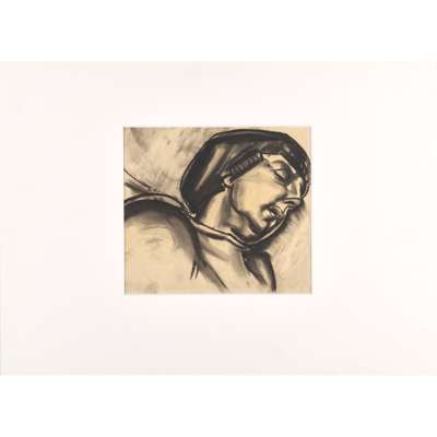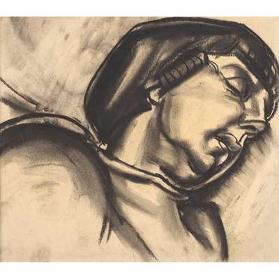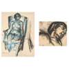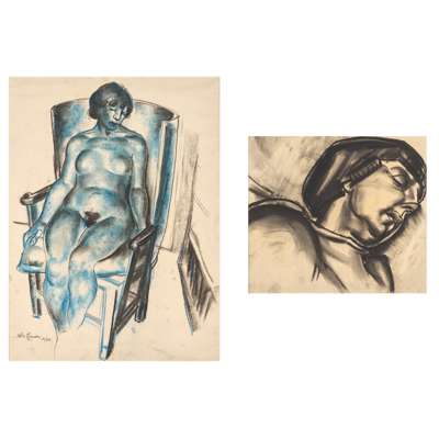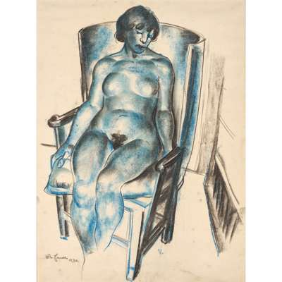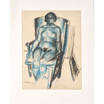 Blue Nude in an Orkney Chair, signed and dated lower left, charcoal and blue chalk (2)