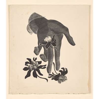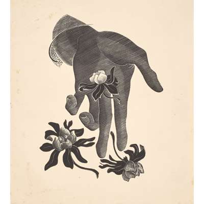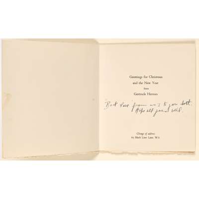 Hand and Aconites, Wood engraving, inscribed inside ‘best love from us 3 to you both. Hope all goes well.' and printed ‘Greetings for Christmas and the New Year from Gertrude Hermes. Change of address: 65 Black Lion Lane, W6’;
