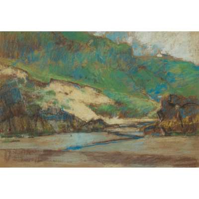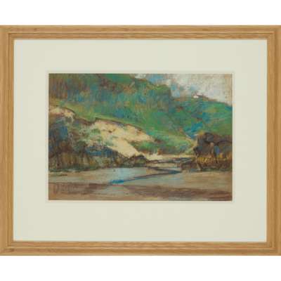 During his artistic training James Paterson spent long spells on the continent, where his work was indelibly influenced by paintings by the French romantics - particularly Camille Corot. Upon Paterson’s return to Glasgow he fell in with the anti-artistic establishment group of painters dubbed ‘The Glasgow Boys, producing atmospheric, diaphanous watercolours, pastels and oils which celebrated the tonal harmonies achieved by the contrast of blue and brown. In 1884 he settled in Moniaive, where he produced what is generally agreed to be his finest work.