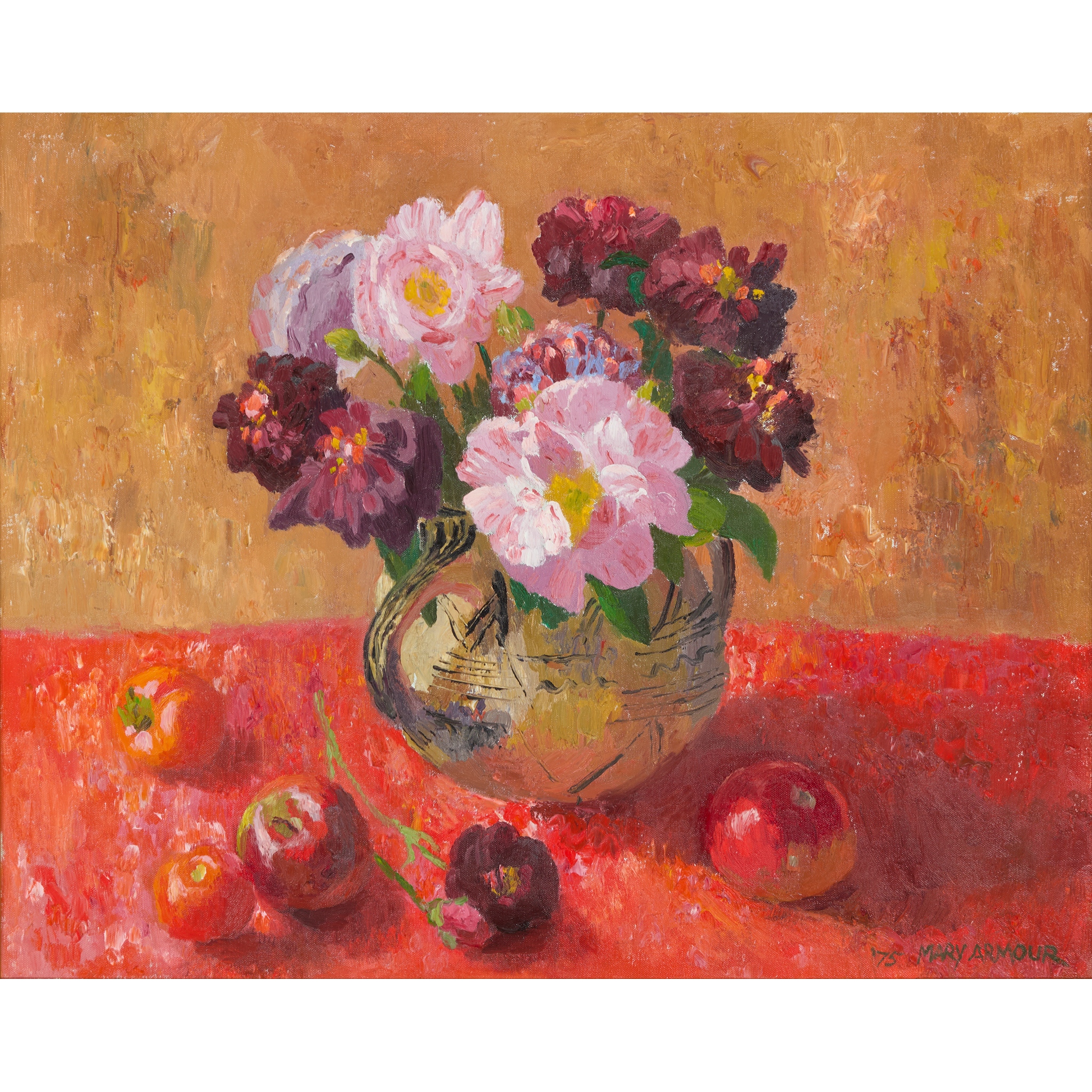 Celebrated for her jewel-toned still lifes and sensitive landscapes, Mary Armour's work is instantly recognisable. Her mature style developed during a tenure teaching still life painting at Glasgow School of Art between 1951-61, where she was exposed to modern European artistic ideas. This inspired her subsequent work profoundly. From the 1930s Armour exhibited at the Royal Academy, Royal Scottish Academy, Royal Scottish Society of Painters in Watercolour, Scottish Society of Artists, and Glasgow Institute of the Fine Arts.