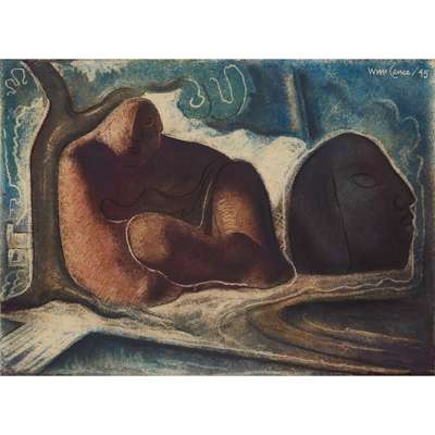 The 1935 fireclay sculpture Rhythmical Figure (lot 2) features in McCance’s 1945 watercolour wax resists Lucifer Nos. 1 & 3 (lots 1 & 32) and his 1946 oil painting Seated Figure with Fruit (lot 3).