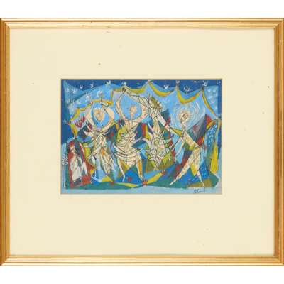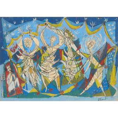 In the Sax Shaw Memorial Exhibition this picture was displayed within a collection of tapestry cartoons and studies created between 1947 and 1958, some of which were designs for Dovecot Studios. The online catalogue suggests that this particular work was a speculative tapestry design.