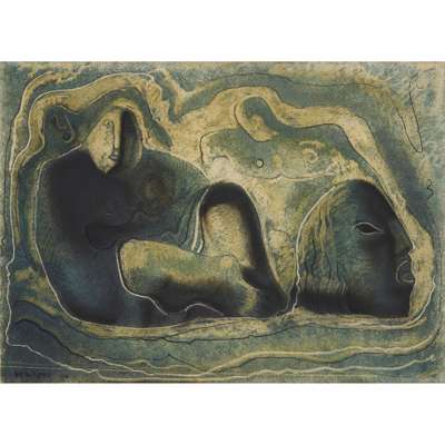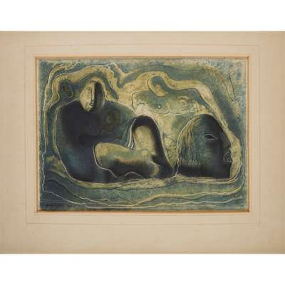 The 1935 fireclay sculpture Rhythmical Figure (lot 2) features in McCance’s 1945 watercolour wax resists Lucifer Nos. 1 & 3 (lots 1 & 32) and his 1946 oil painting Seated Figure with Fruit (lot 3).