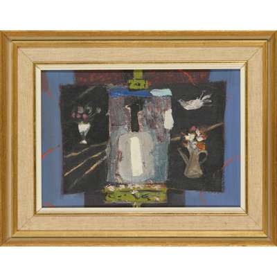 Born in Lochwinnoch, David McClure became a painter, teacher, and writer, after having attended Queen’s Park School in Glasgow, Edinburgh University, and Edinburgh College of Art. McClure went on to receive a traveling scholarship and Andrew Grant fellowship in which he embarked on several enriching journeys to Italy, Spain, and Sicily before settling down to teach at Dundee College of Art. There, he became the head of the painting school. Known for his figurative subject matter and layered compositions, and borrowing whimsical qualities from John Maxwell’s paintings, David McClure’s works embrace the playful “painting within a painting” technique to depict vivid still lifes.