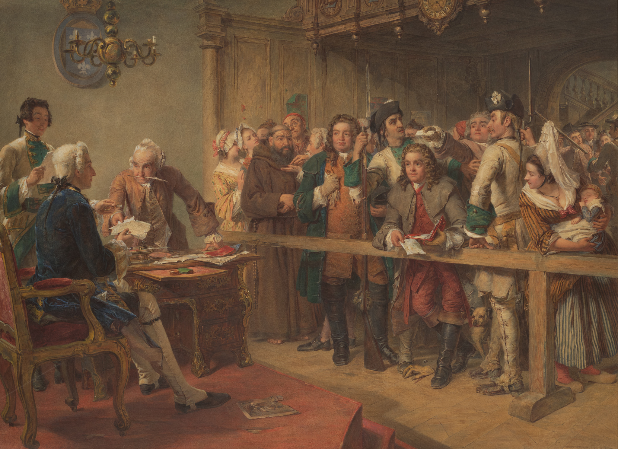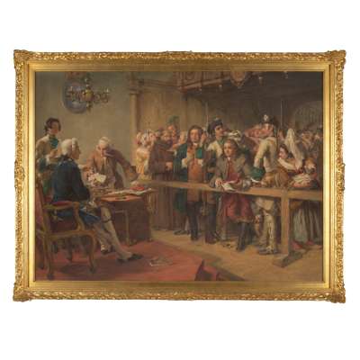 This print is after William Powell Frith's oil painting ‘Hogarth brought before the Governor of Calais as a Spy’ which was exhibited at the Royal Academy, London, in 1851.