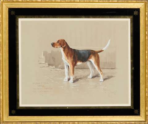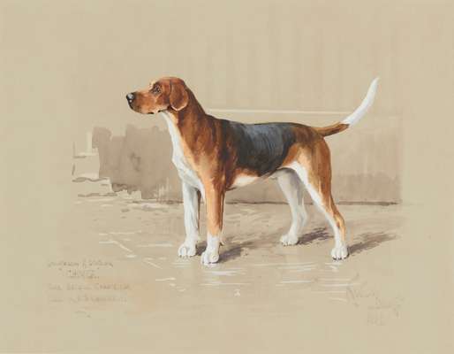Signed and dated 1926 lower right, inscribed with details of the hunt and name of dog lower left, watercolour and gouache