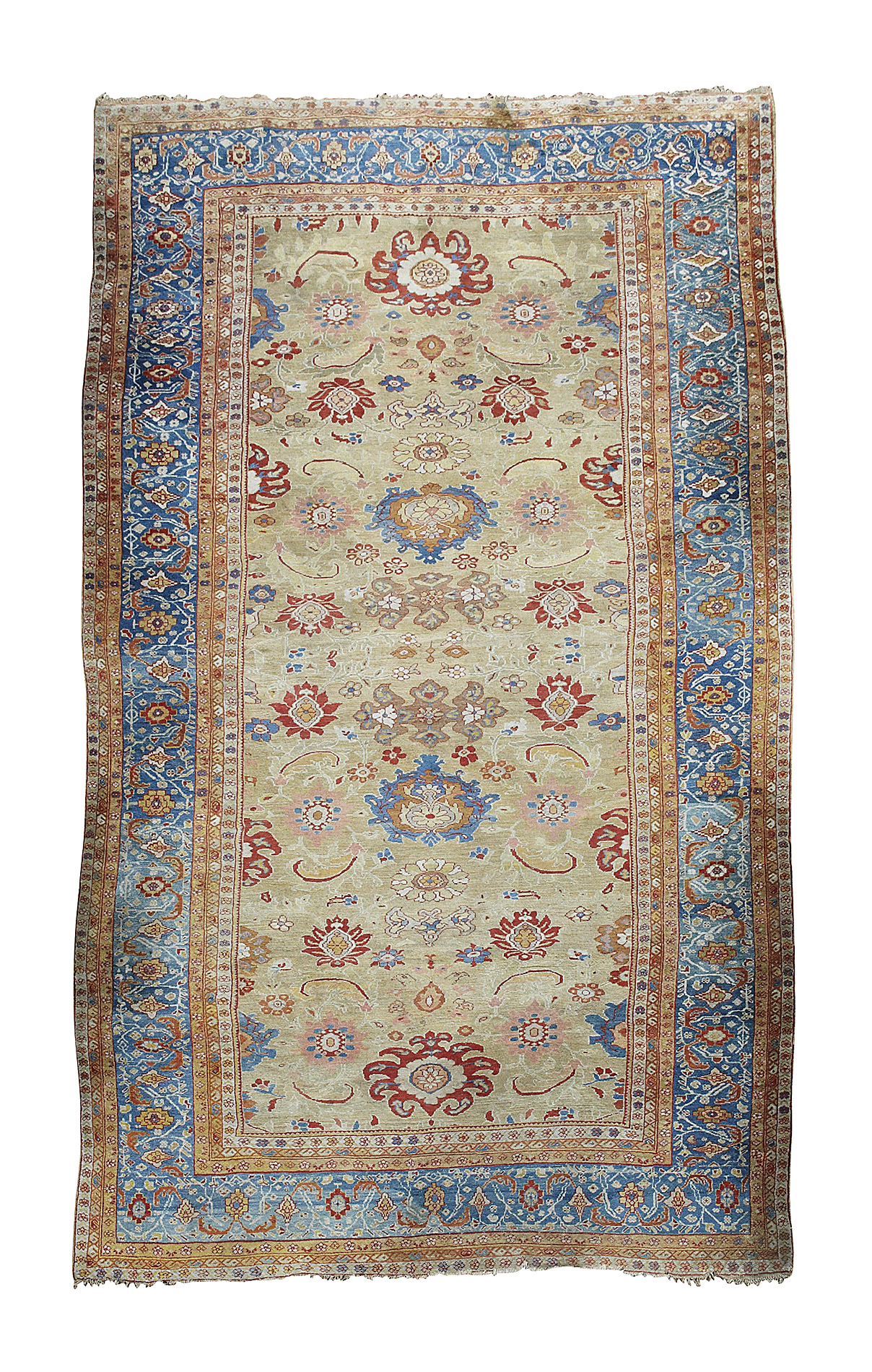 Note: These fashionable carpets were produced in the town of Sultanabad in Iran by the Manchester based Anglo-Swiss firm of Ziegler & Company from around 1880. Having already established business connections in Turkey and Iran through the export of printed cottons from their English-based firm, they established their own looms for the production of carpets for the European and American markets, becoming the first successful European manufacturer to do so. Their economic presence became so great that the town was known as 'Fort Ziegler'. The company used ready-dyed wools for colour consistency, large looms to achieve the required sizes for Western homes and offered a regular wage to local weavers. Ziegler carpets were made to achieve a balance and symmetry in keeping with the scale of a room and its furnishings and often have a design and colour palette in harmony with fashionable European movements of the time.