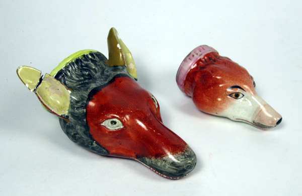 FOUR STAFFORDSHIRE POTTERY FOX HEAD STIRRUP CUPS