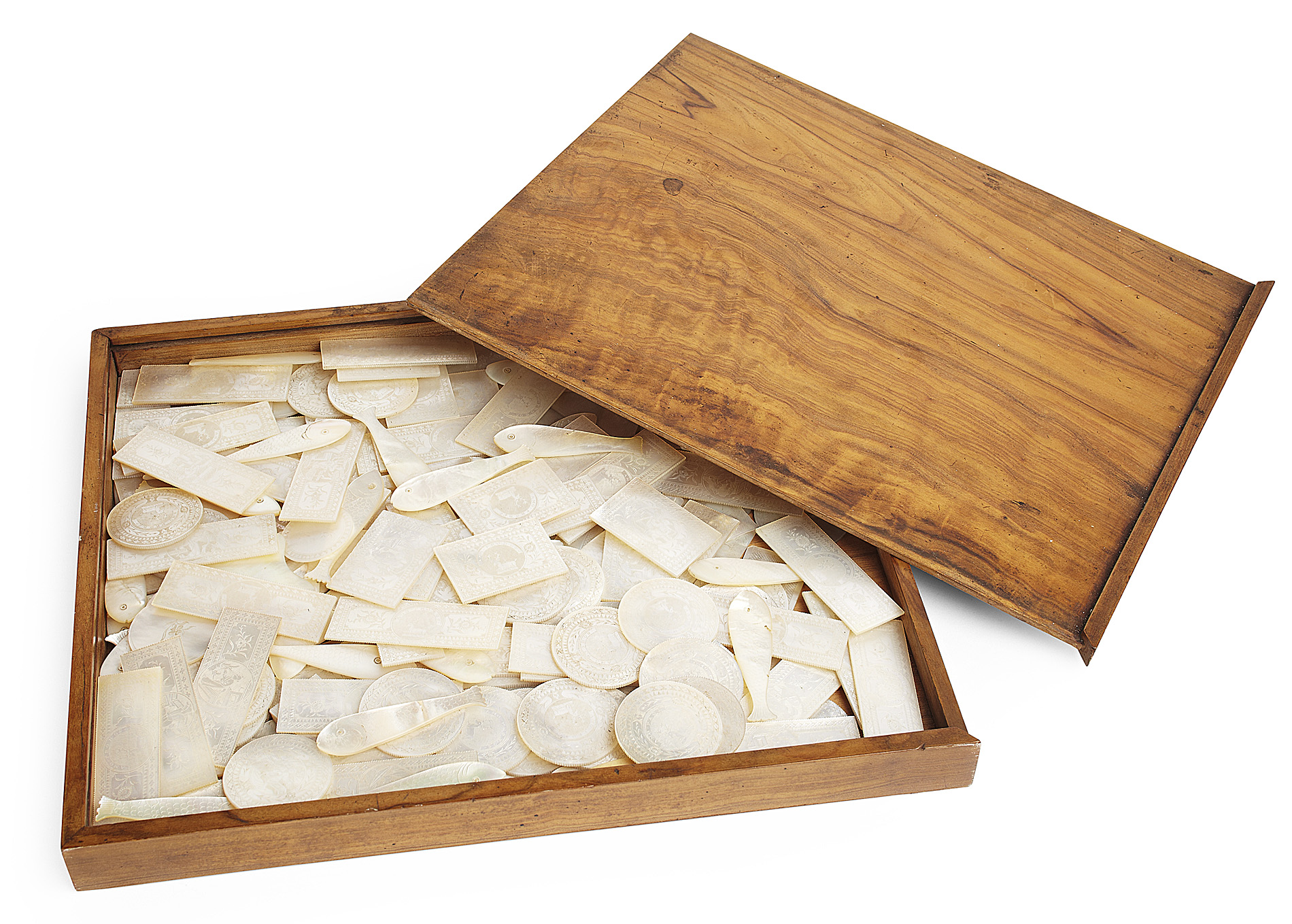 BOXED SET OF CHINESE EXPORT MOTHER-OF-PEARL 'BLAIR' GAMING COUNTERS