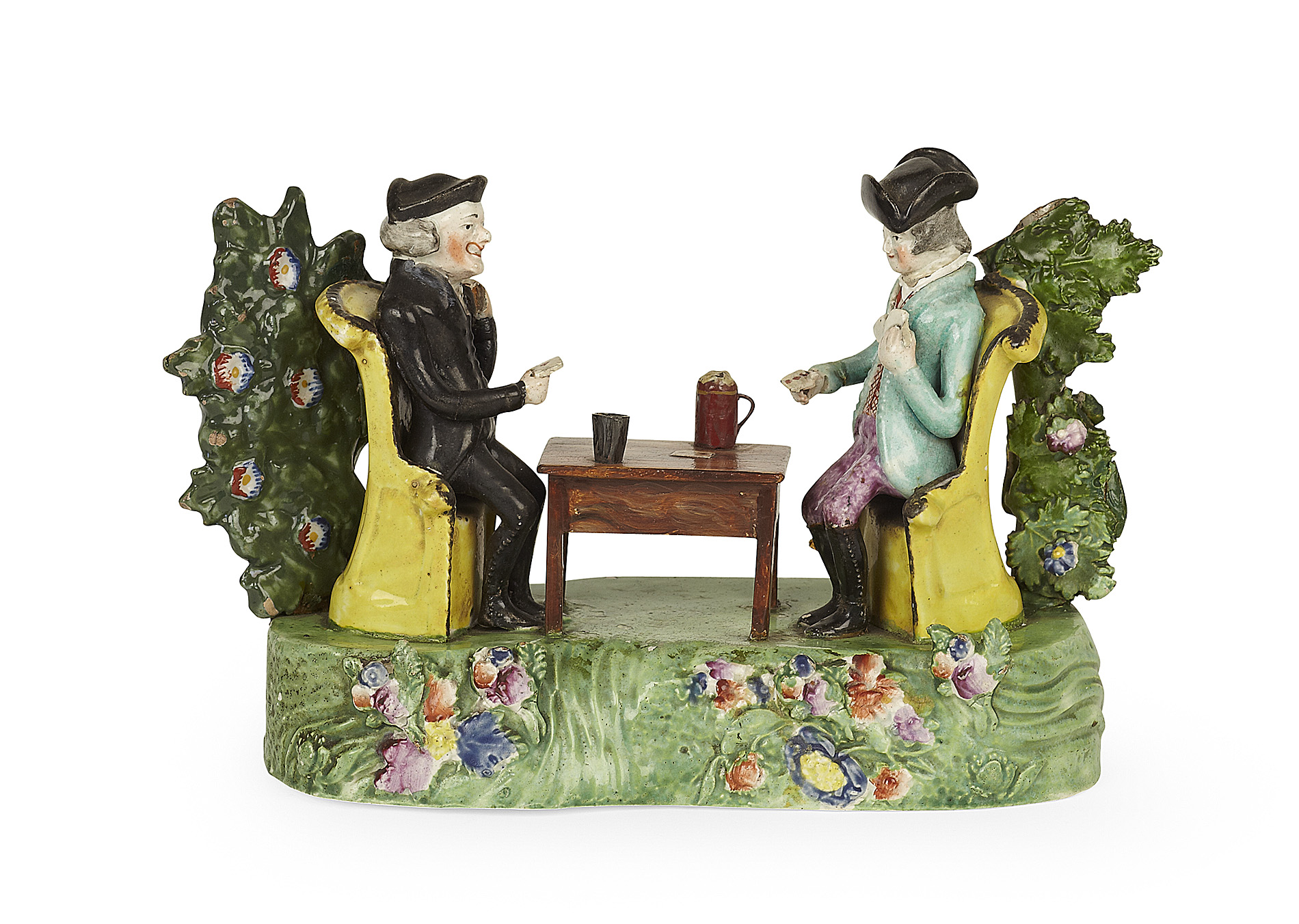 Note:Doctor Syntax was one of the early nineteenth century's most popular literary characters. He was the brainchild of Thomas Rowlandson, the eminent caricaturist and watercolorist. Traditionally, a book's text inspires its illustrations, but in the case of Doctor Syntax, the text was written by William Combe in verse form to accompany Rowlandson's artwork. Doctor Syntax appealed to the English love of the absurd, and Staffordshire's figure potters capitalized on the comic theme by producing their own interpretations of the eccentric clergyman. Doctor Syntax does indeed play cards in the book published in 1821, but that illustration differs markedly from this figure group. It seems that the story alone inspired the creation of the group.