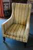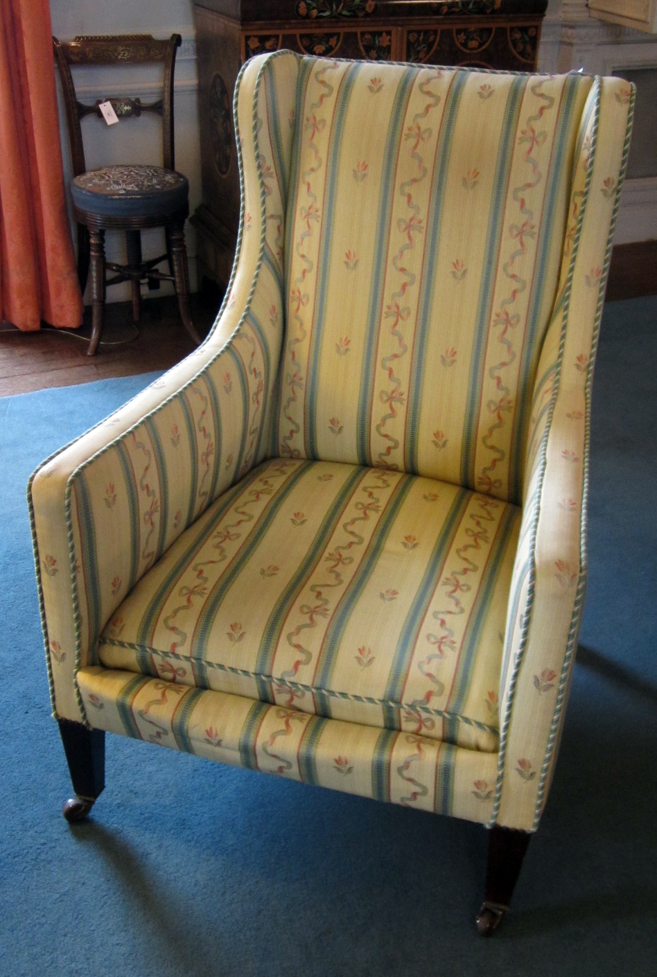 of George III style, the tall back with squared wings and arms over a loose cushion seat all in cream and blue striped fabric, raised on square tapered legs with castors,