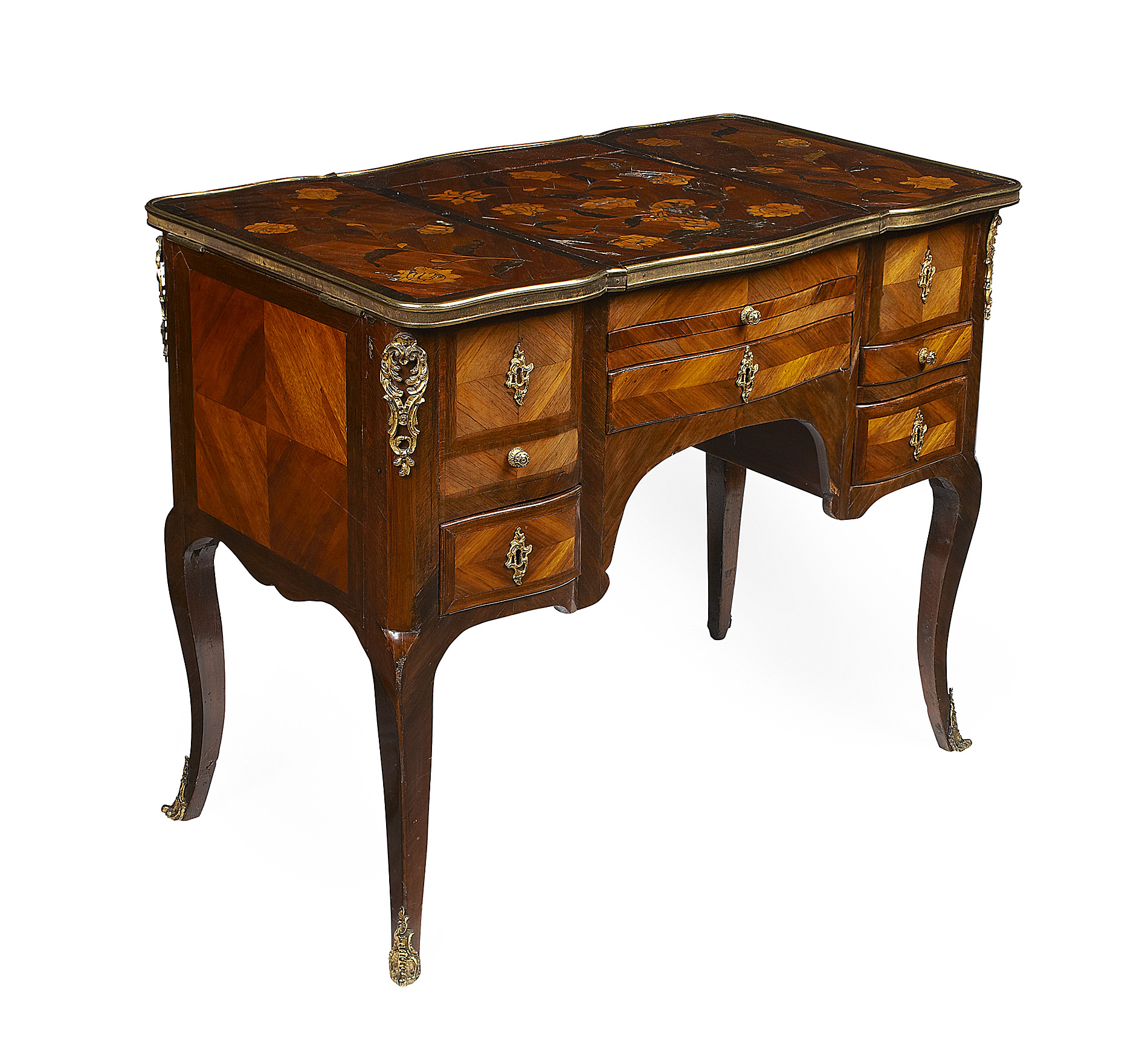 the hinged shaped top with a mirror plate over void wells and an arrangement of drawers around a kneehole, raised on square cabriole legs