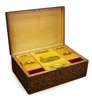 The well drawn hinged lid opening to a removable tray with lidded compartments, stamped mark