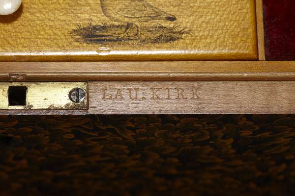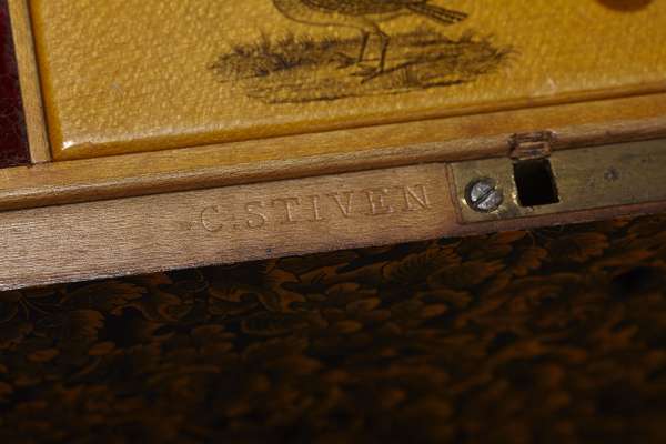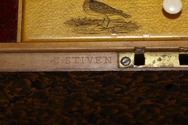 Note:Charles Stiven (1753-1820) was a renowned box maker who commonly used the 'invisible hinge', thought to have been invented by John Sandy of nearby Alyth. The boxes were of sycamore, decorated in penwork and paint and heavily varnished. The town was so well known for production of this type that all such boxes were known as 'Laurencekirk boxes'. After 1821, the focus for production of this type moved to Mauchline.