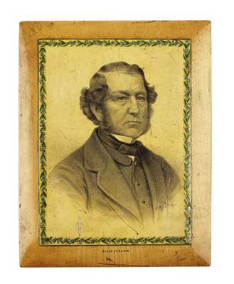 Note:An 1879 press cutting about the house notes that the box with William Fordyce's portrait: "is noteworthy as the first ever done in this style. It was a notion of the captain's own to have his portrait put on a box lid; but when he made the suggestion to the ingenious Mr Smith of Mauchline that gentleman laughed and expressed his decided opinion that it would never do. The experiment was made however, and it proved a great hit. Thousands of boxes have since been turned out in this style."