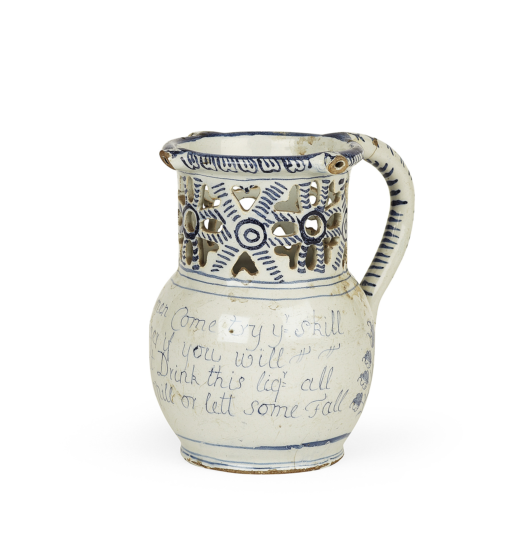 pierced baluster form, inscribed 'Here Gentlemen Come try y'r skill/ Ile hold a wager if you will/ That you Don't Drink this liq'r all/ Without you spill or let some Fall'