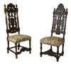 of Baroque style, the tall backs carved with urns and C-scrolls and surmounted by a carved openwork cresting, flanked by turned side rails with finials (2)