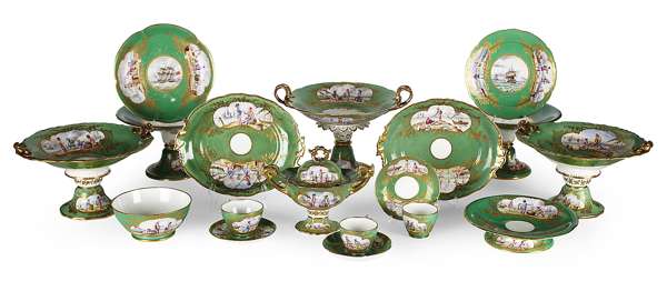 each with painted scenes of laborers by a coastline, reserved on a green ground with gilt highlights, comprising: a twin-handled footed comport, two smaller twin-handled footed comports, two footed comports, two sauce tureens and covers, four low oval comports, four low circular comports, 13 teacups, 12 coffee cups, five smaller cups, 20 saucers, a slop bowl, 12 circular desert plates; four shaped desert plates and two shallow dishes (qty)