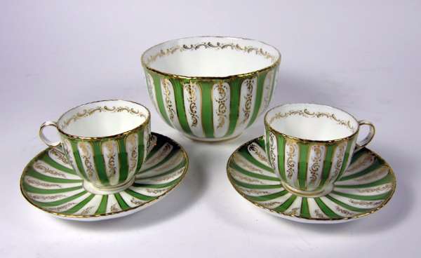 comprising: a Rockingham green and white partial service with yellow flowers, twenty six pieces; a partial green striped service, twenty two pieces; and a Whittaker, Heath & Co. seven piece partial service decorated with butterflies and flowers (qty)