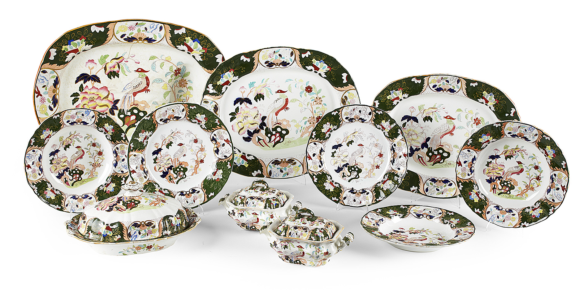 each piece painted with an exotic bird amongst foliage, in the Chinese style, surrounded by foliate borders on a green ground with gilt highlights, some with maker's marks, comprising of: a large oval meat dish; three graduated oval ashets; two oval tureens and covers; two further covers (tureens lacking); two smaller rectangular tureens and covers; three dishes of assorted shape and size (covers lacking); a tureen (cover lacking, damages); a rectangular cover (tureen lacking); 12 soup plates; 23 dessert plates; 31 dinner plates; one fish plate; and 13 luncheon plates (qty)