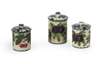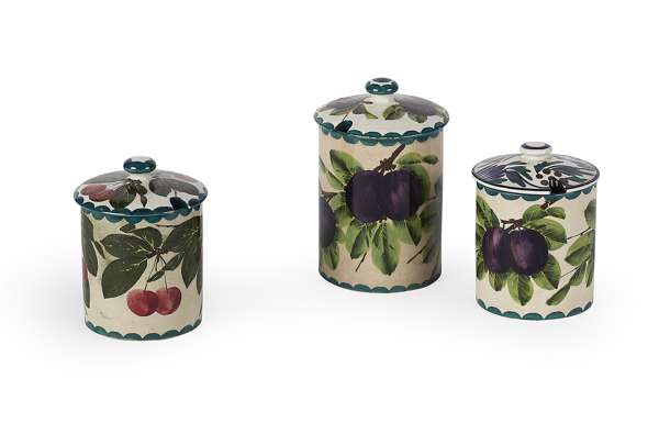 of cylindrical form, comprising: purple plums, red cherries and another purple plums with associated lid, impressed and painted marks (3)
