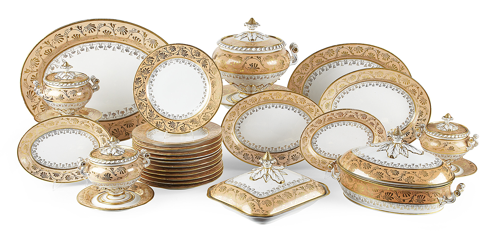 each piece with stylised gilt floral decoration on a salmon-pink ground, with further gilt highlights, some with impressed maker's marks, comprising: 13 graduated oval ashets, twin-handled oval shaped tureen and cover, a further twin-handled oval shaped tureen (cover lacking), four rectangular tureens and covers, a large footed circular soup tureen, cover and stand, six sauce tureens, covers and stands, a square shaped tureen (cover lacking), a low circular comport, a circular stand and cover (tureen lacking), 70 dinner plates and 17 soup plates (qty)