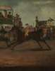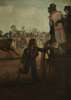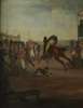 'The Last of the Leith Races' is a fine example of the features which define Howe stylistically. A master of panoramic composition, he depicts a sweep along the sands of Leith; gleefully plunging the viewer firmly into the thick of the action. By adopting a naïve, almost primitive style, Howe is able to tangibly evoke the movement and excitement of the horses charging past. Often characterised by a sense of personality and humour, his energetic painting technique was ideally suited to the depiction of this notoriously raucous event. Among the hubbub of the scene our eyes are drawn to the prize awaiting its victor on the far stand, the lame beggar requesting alms in the foreground and the high-blooded hunters champing at their bits, nostrils flared with exhilaration.