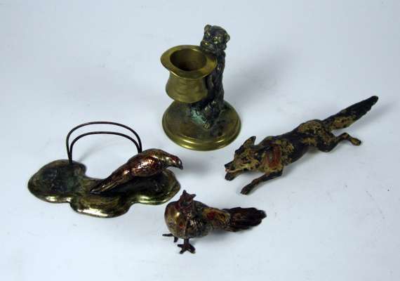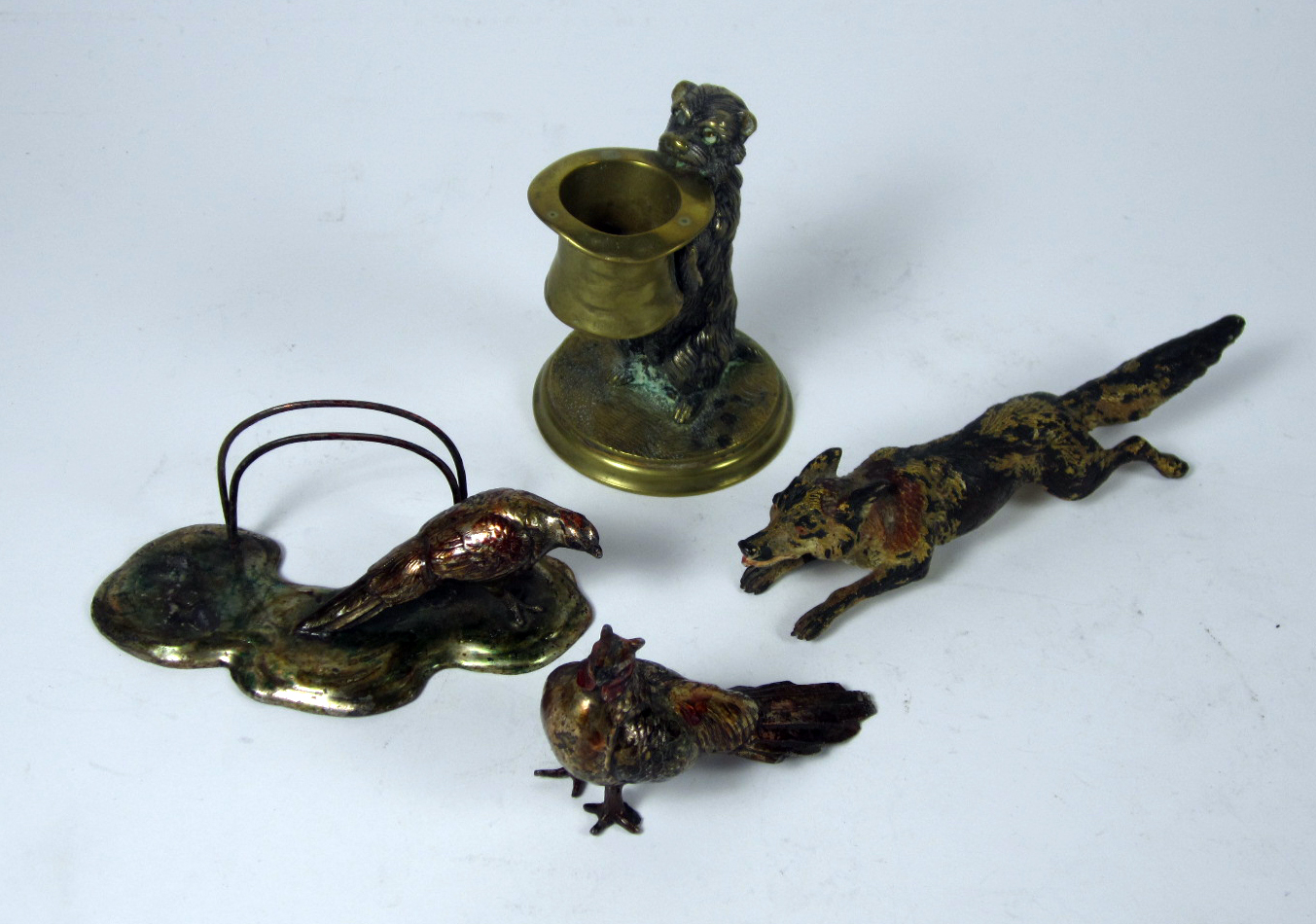 including: an Austrian cold painted bronze fox, a bronze terrier with top hat match holder, pheasant place card holders, tin painted huntsman, desk weights, a cigar cutter etc (qty)