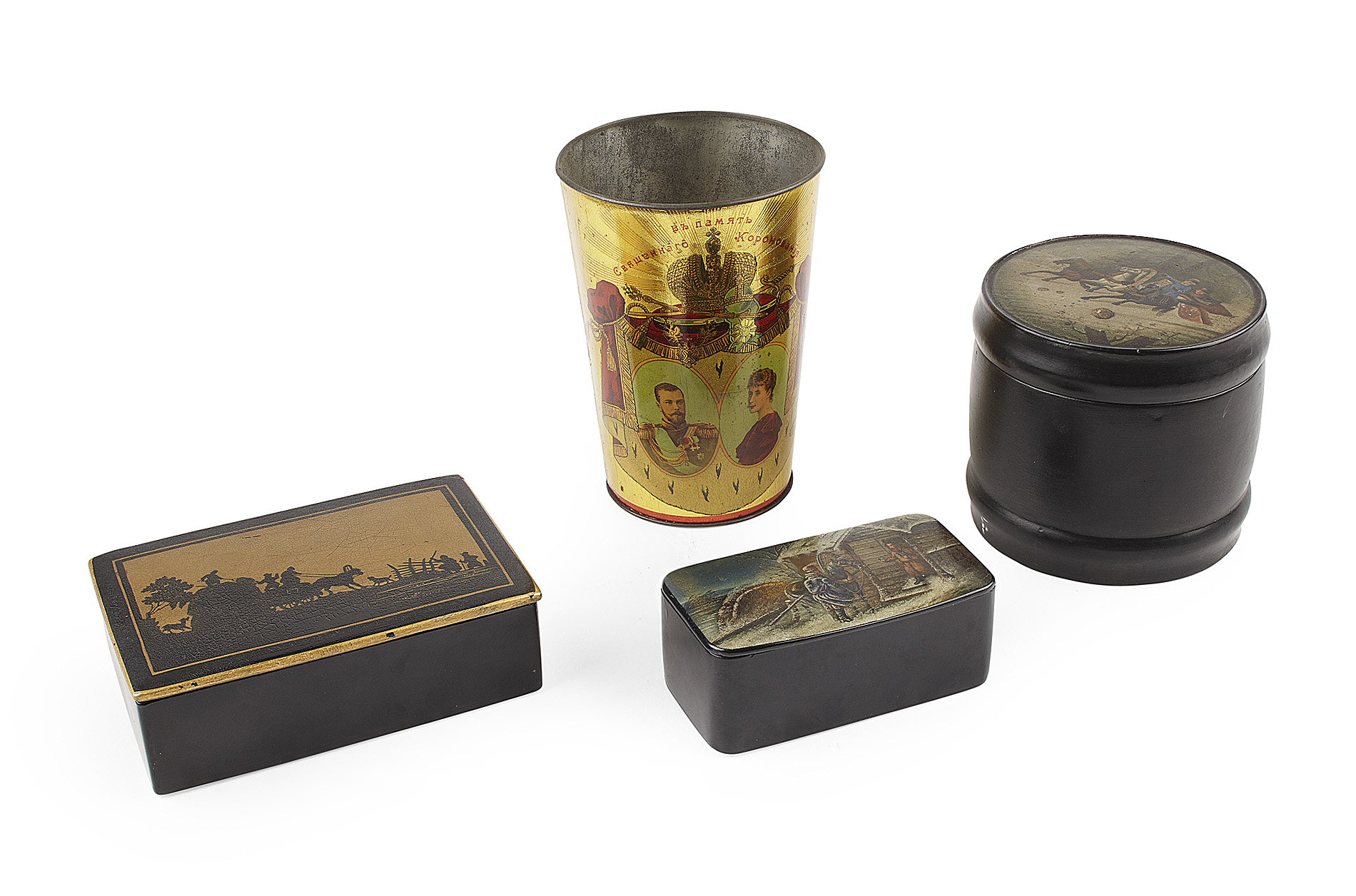 one of circular outline with troika scene, stamped Vishniakov mark; one of rectangular outline depicting a horse and hay cart, Lukutin double head eagle mark; another of rectangular outline with a silhouette of peasants with haycart, stamped Lukutin mark; and a TIN COMMEMORATIVE BEAKER, of tapered cylindrical form, with coronation portraits of Tsar and Tsarina (4)