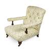 with a square button tufted back and open arms, on turned legs, in cream foliate upholstery