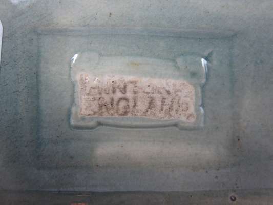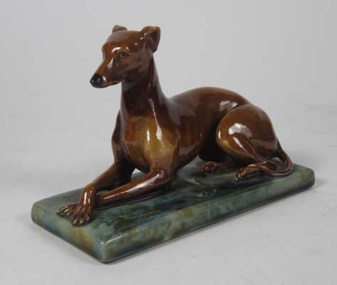 modelled recumbant on a green rectangular plinth, applied tablet mark