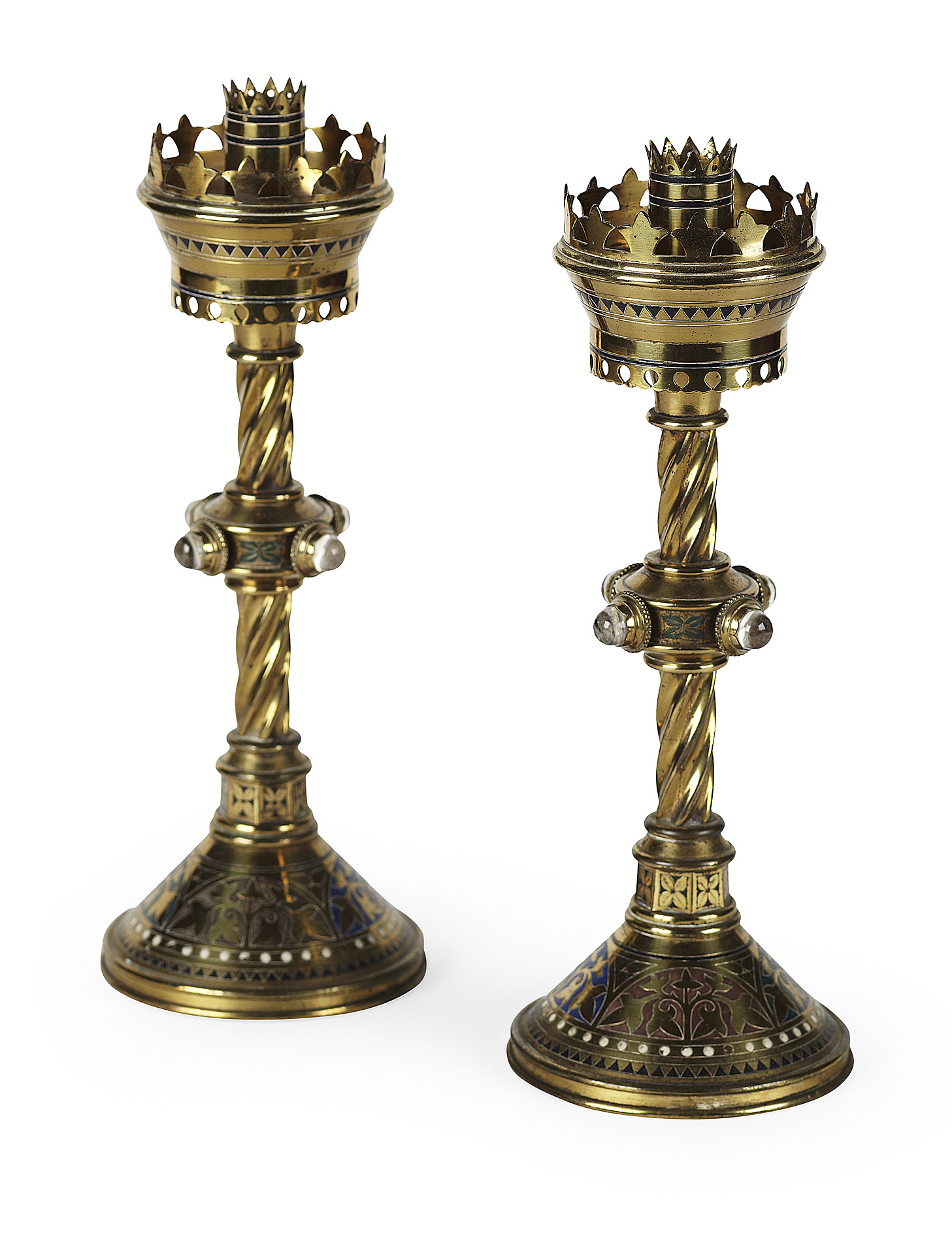of Gothic Revival style, each with a barley twist stem supporting a pierced sconce above the glass set and enamelled knop, all on an enamelled conical base (2)