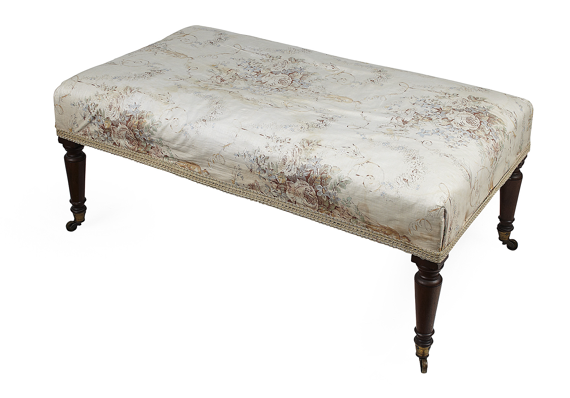 the rectangular seat covered in cream floral fabric, on turned legs with brass caps and castors