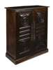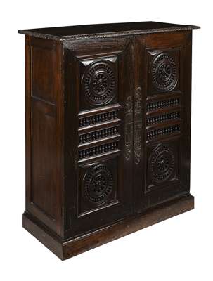 the carved and moulded top over a pair of pierced panel doors with spindle decoration, on plinth base
