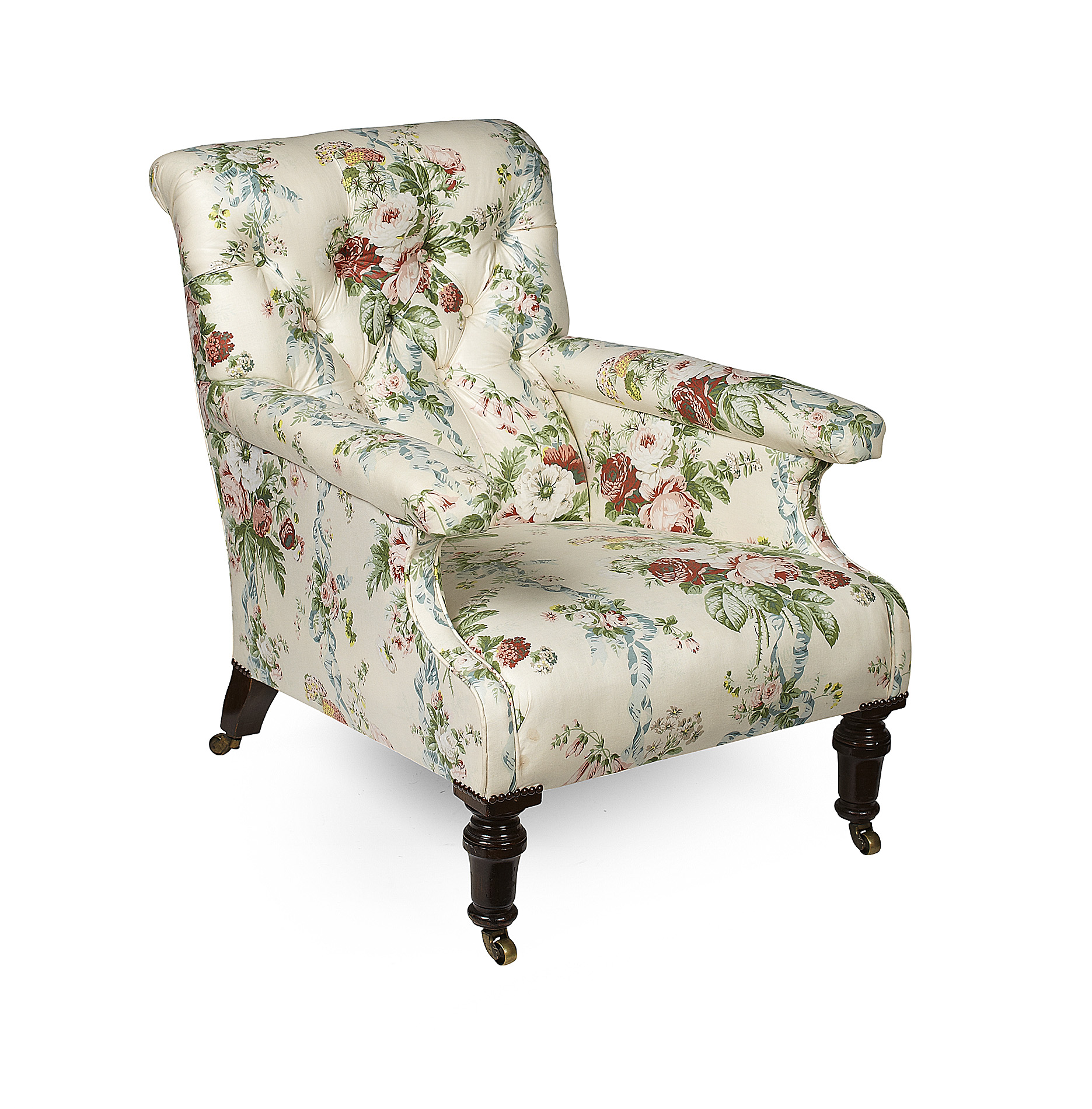 the button tufted back over straight arms, raised on turned legs with brass caps and castors, stamped