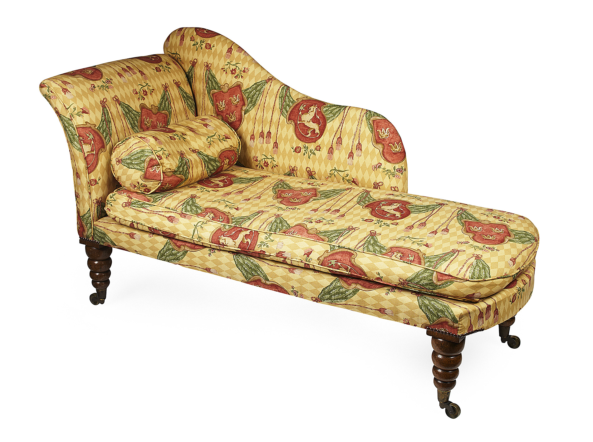with a scroll arm to one end over a loose cushion seat, on tapered bobbin turned legs with castors