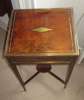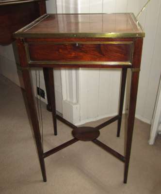 the hinged lid enclosing a later compartmented tray, raised on slender square section legs, united by a cross form stretcher