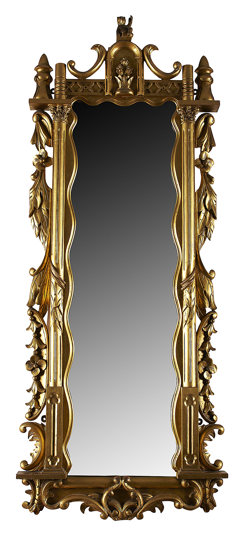 the rectangular mirror plate in a wavy moulded slip flanked by columns and foliate trails, surmounted by a carved bear finial