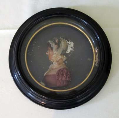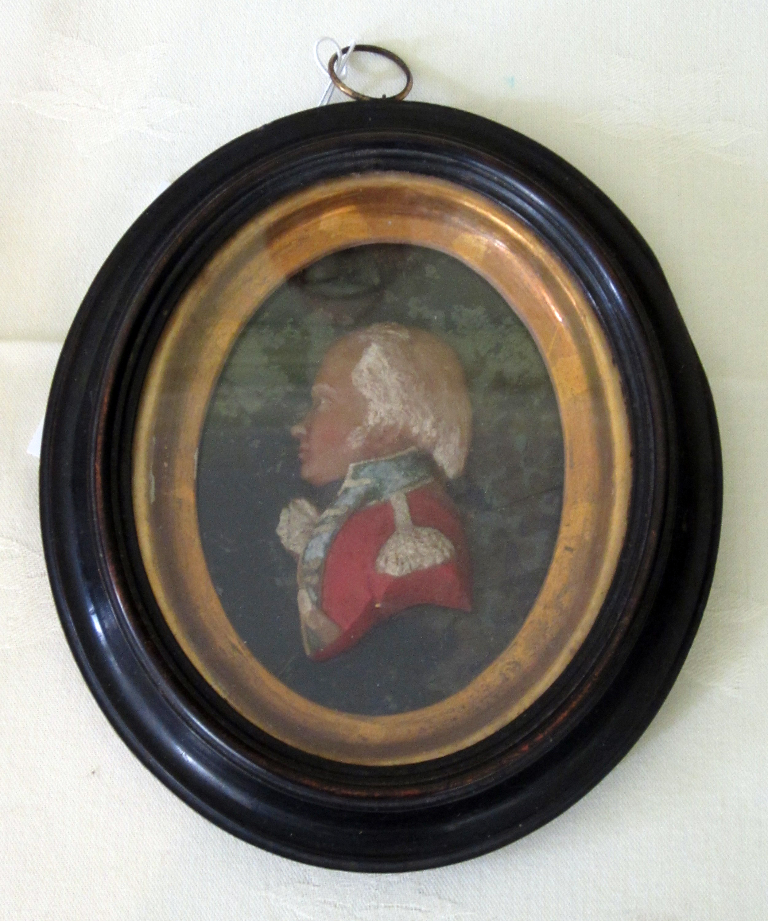 comprising: a three quarter figure of the Marquess of Granby, a profile portrait of a lady, and a profile portrait of an officer, in gilt slips and ebonised frames (3)