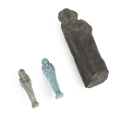 the figural fragment depicting a man with crossed arms and wearing a tall headpiece, the reverse with a hieroglyphic inscription; and TWO EGYPTIAN GLAZED POTTERY USHABTI (3)