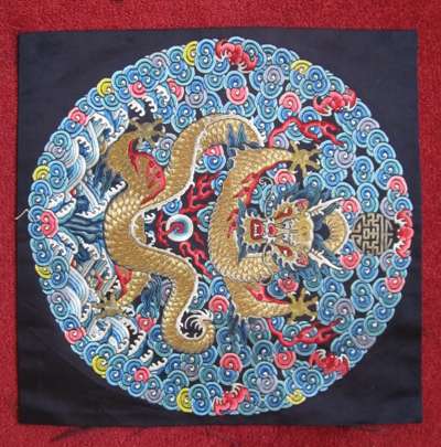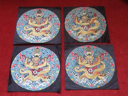 each embroidered with a five clawed dragon with gold thread surround (one cut and joined); a BAG MADE FROM A PAIR OF BADGES; CHINESE HEAD DRESS EMBROIDERED ORNAMENTS; SIX OTHER CHINESE EMBROIDERED PANELS; and EIGHT INDIAN GOLDWORK AND VELVET COSTUME TRIMMINGS (qty)