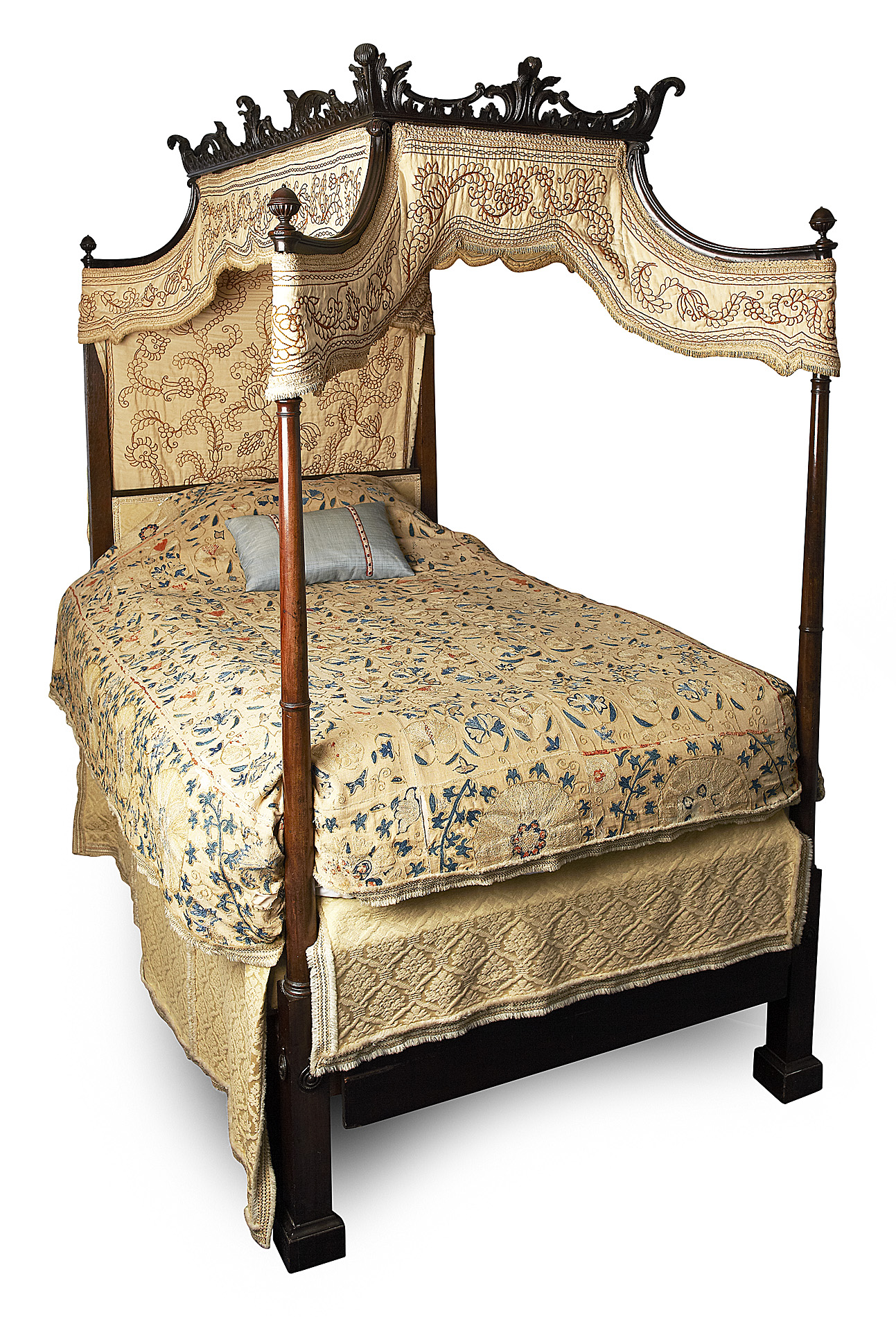 of Chippendale style, the canopy with foliate carved and pierced cresting, supported on turned tapered posts, ending on square legs with block feet, hung with cream and brown embroidered hangings with tassel edging