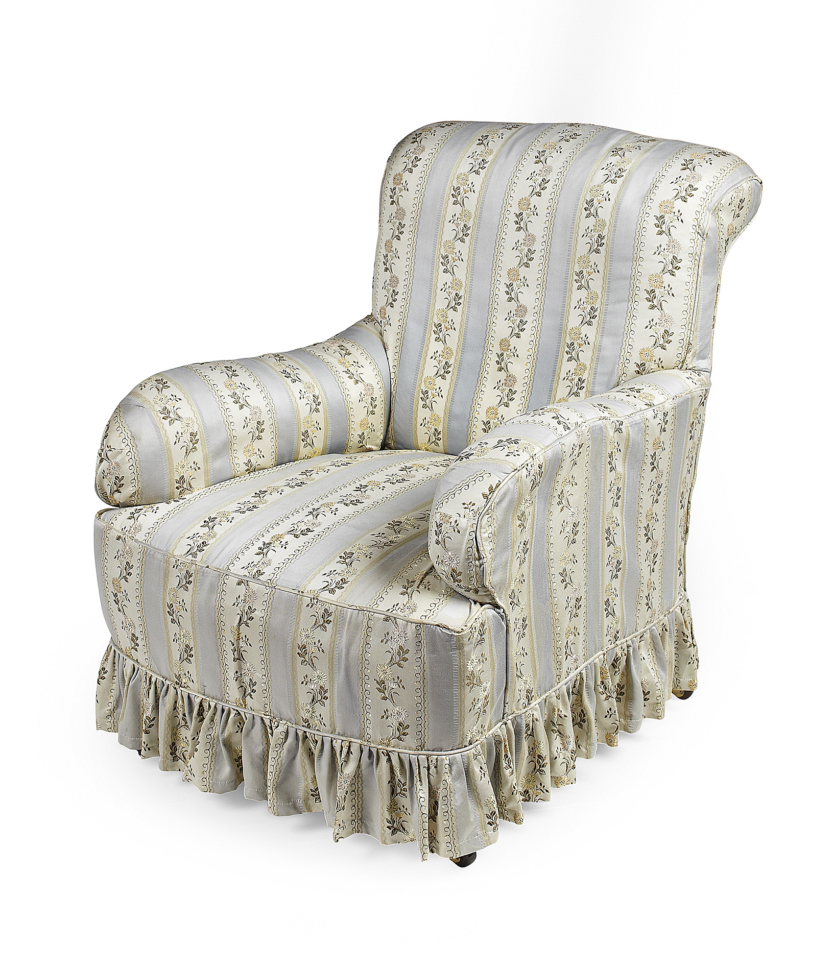 the low scroll back over rounded padded arms, raised on turned legs and castors, with later striped and foliate silk slip