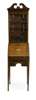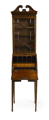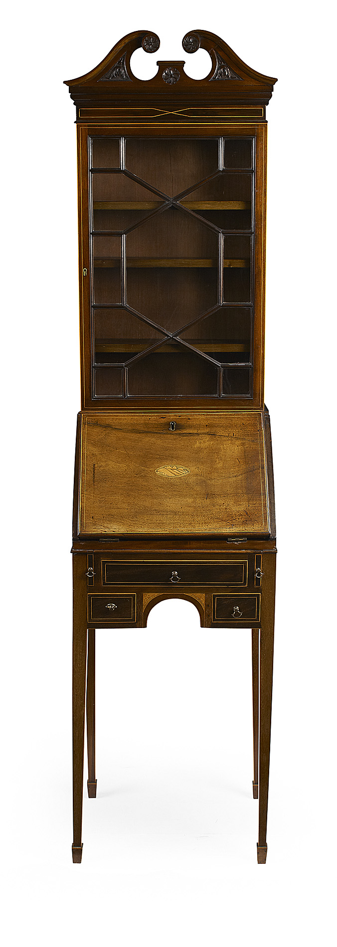 the swan neck pediment over astral glazed door opening to shelves, above fall front revealing pigeon holes and drawers, over one long drawer over two short drawers, square tapered legs ending on splayed feet