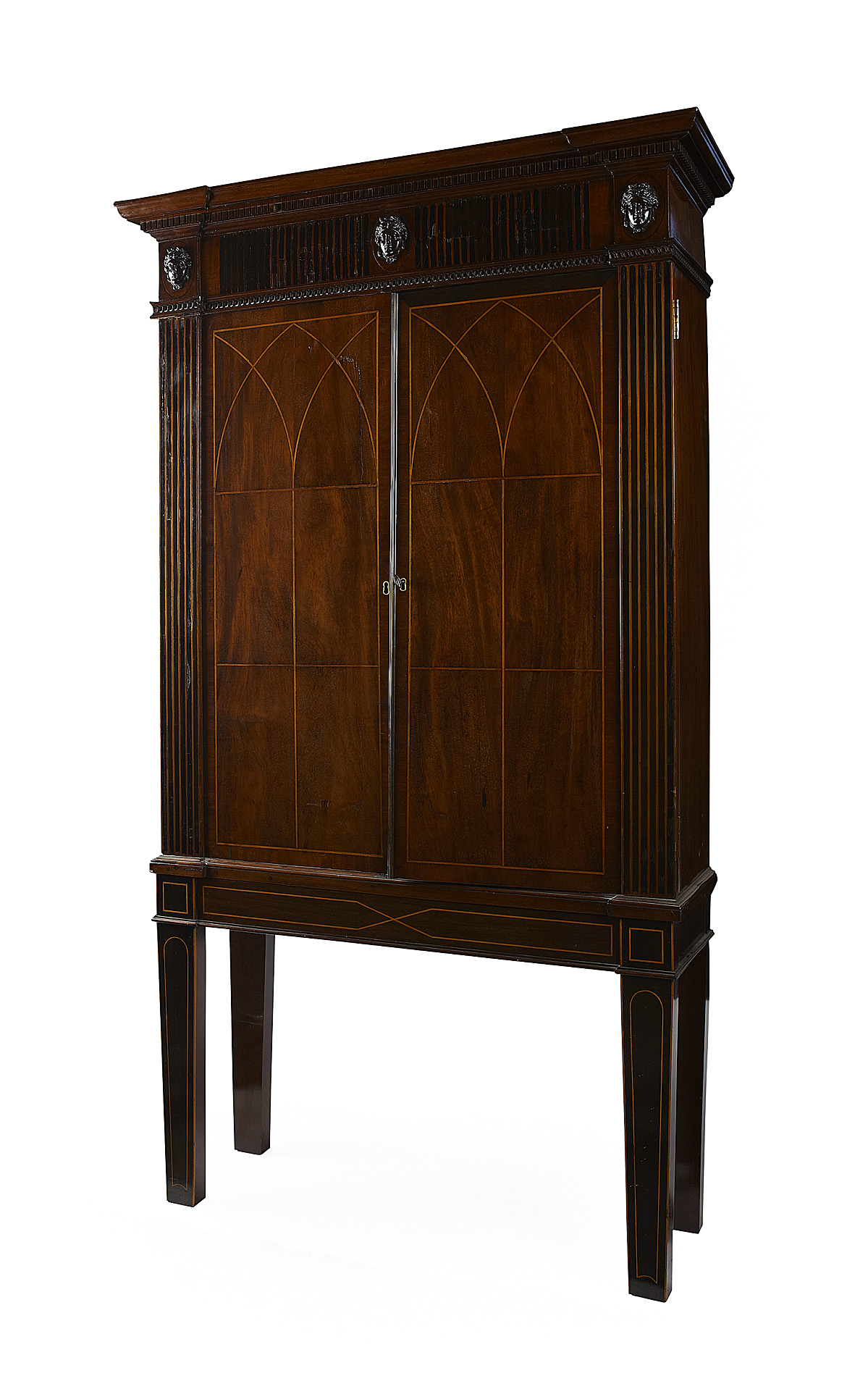 the inverted breakfront cornice over a wide frieze with carved classical female masks above a pair of inlaid cupboard doors flanked by flattened pilasters, the conforming stand raised on flattened squared tapered legs