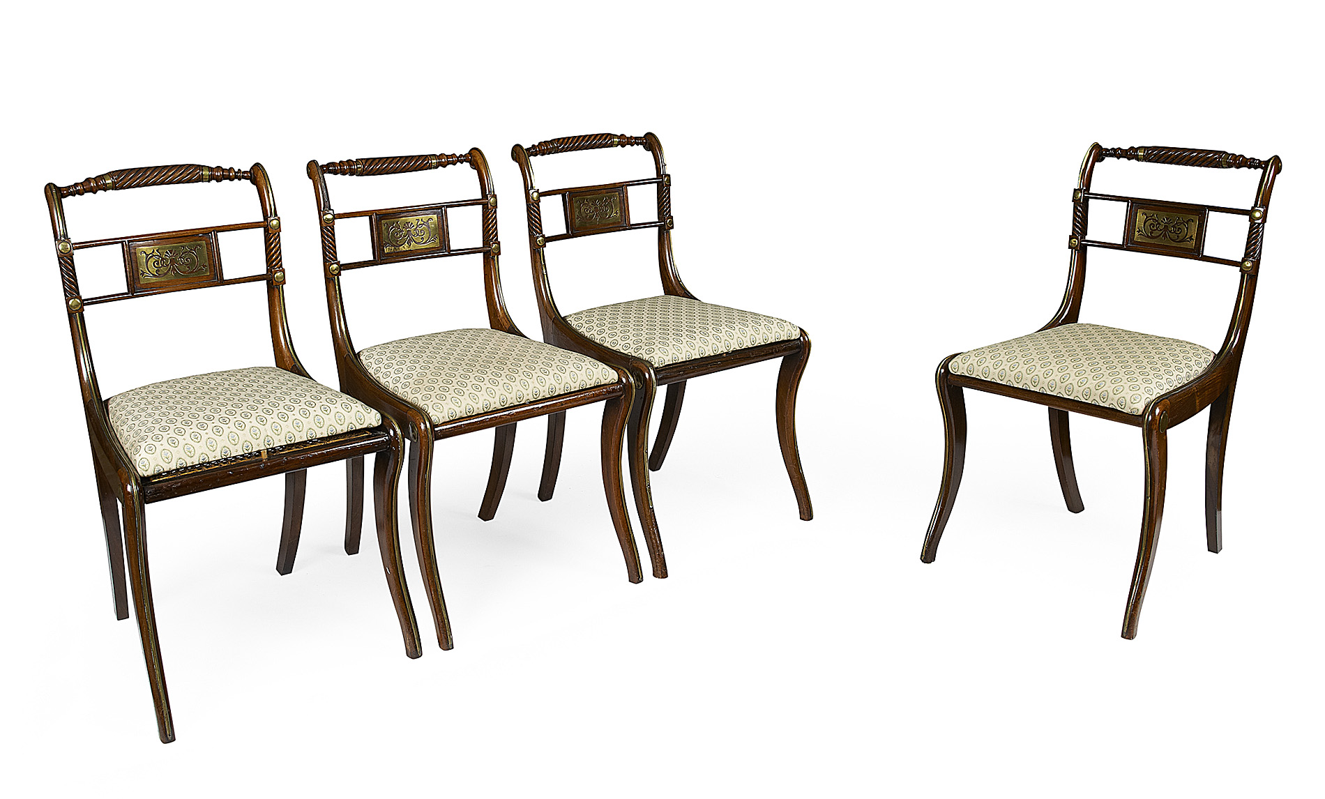 each with spiral carved top rail and brass inlaid horizontal splat over drop in seats, on sabre legs with brass line inlay (4)