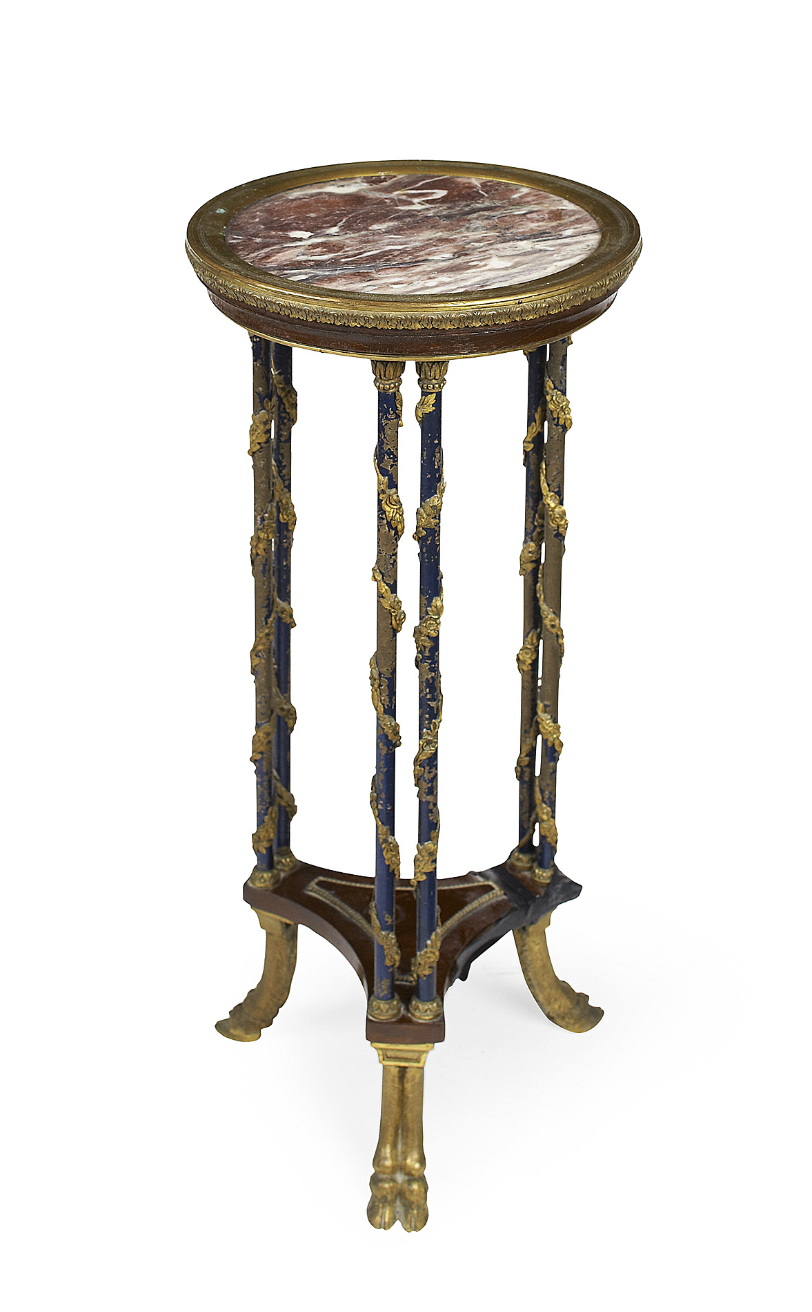 in the manner of Henri Dasson, the circular rouge marble on double column supports entwined with vines, over a triform undertier and raised on hairy hoof feet