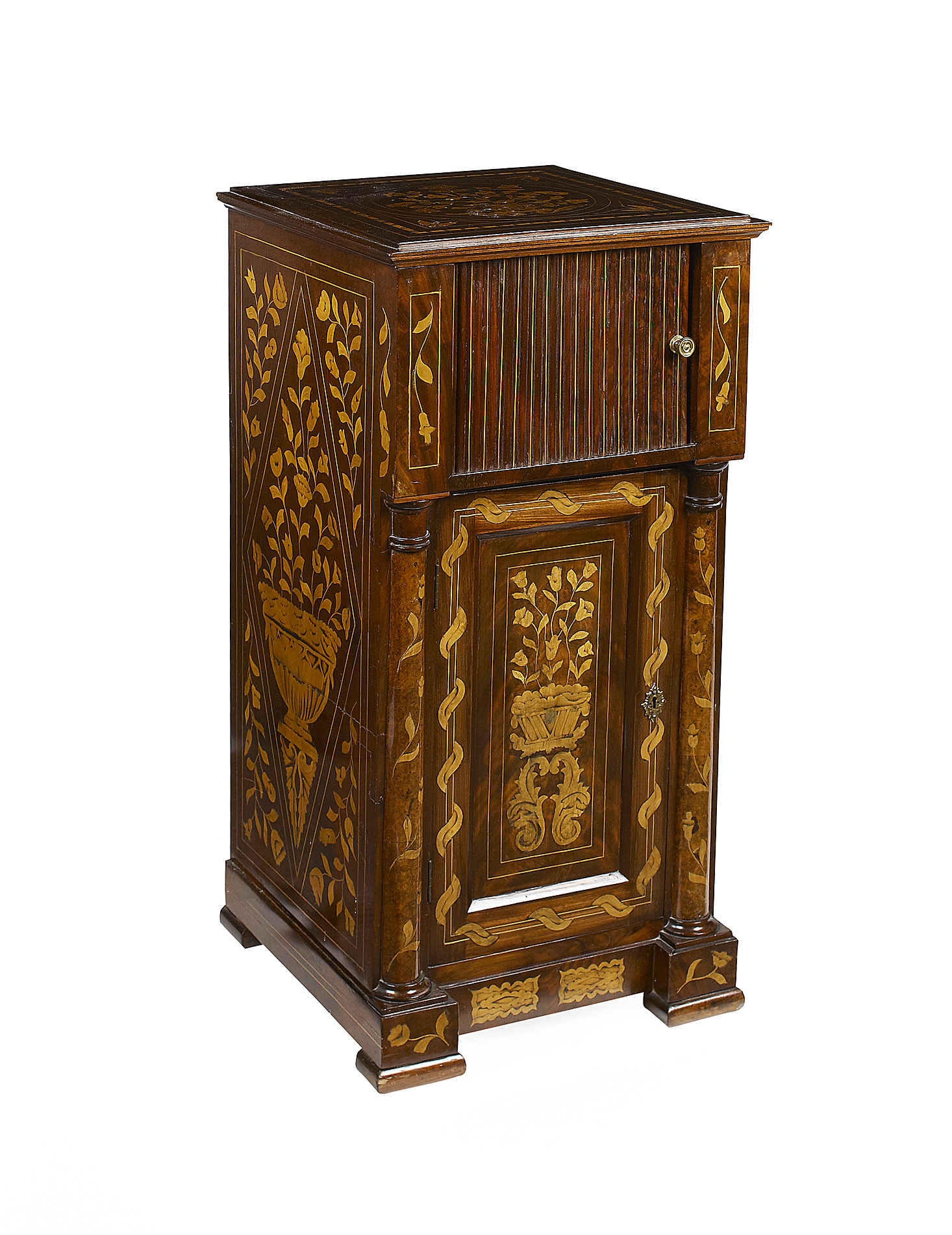 DUTCH MAHOGANY AND MARQUETRY INLAID BEDSIDE CABINET