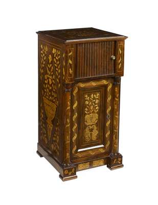 the square top over a tambour door and cupboard door flanked by half columns, on a plinth base, with allover floral and butterfly marquetry